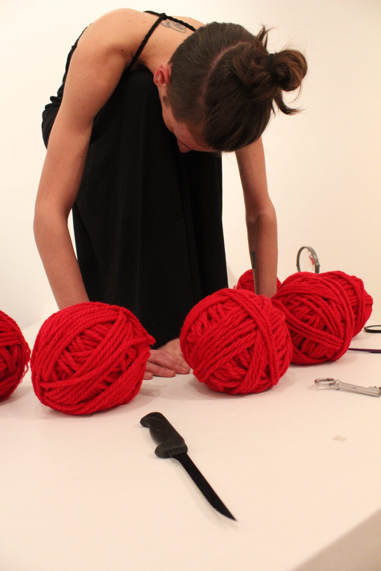 Long durational performance by Marta Lodola. Duration 4 hours, Materials 30 m acrylic red wool, a kitchen knife, a metal old key, a comb, a small mirror, a A5 frame, embroidery lens.