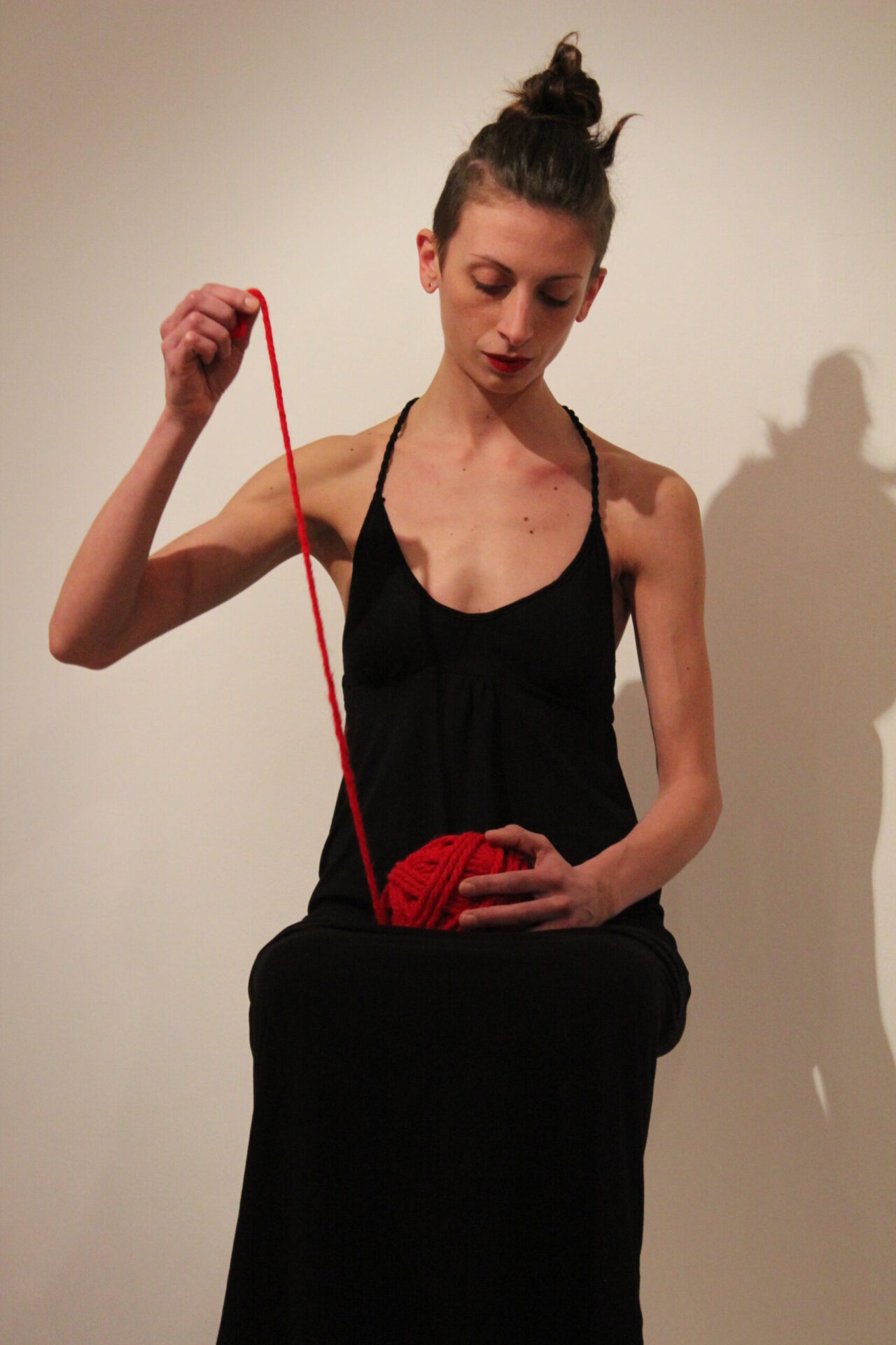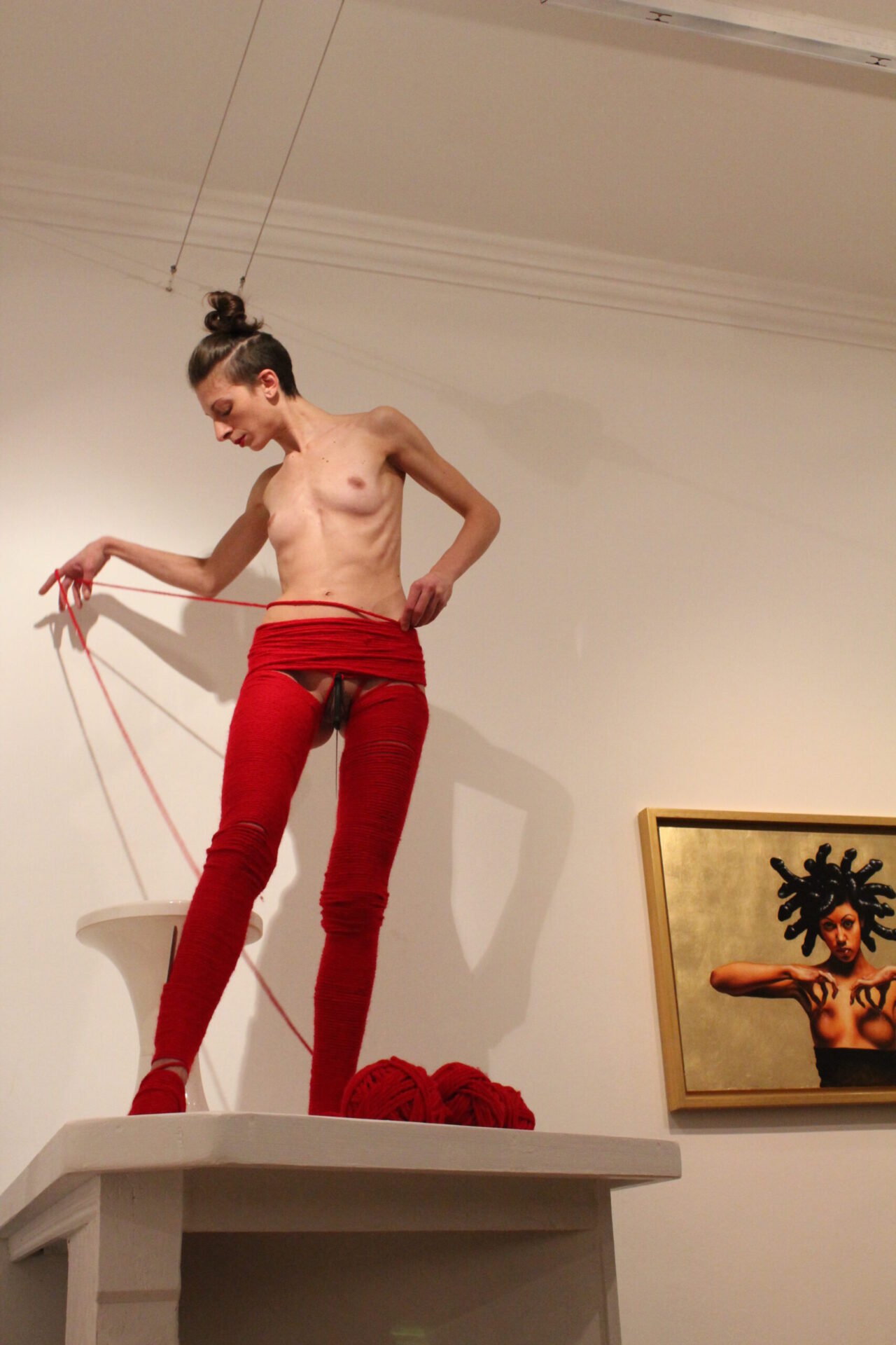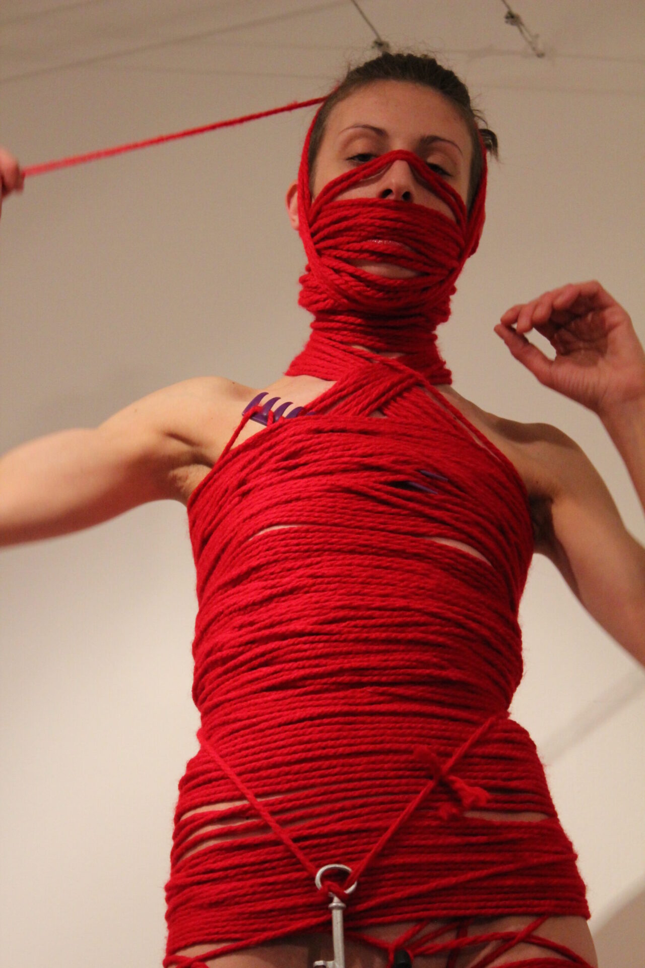 The feminine body has always been the biggest proponent and inspiration for beauty and sin, finding itself in the middle of the paradox generated by our intrinsic imperfection: the general parameters of the ideal body – an imposed model of what sexual attractive should be – don’t correspond of what actually is in nature. A woman naked body is animalistic, sensual, powerful and it comes in all shapes and sizes. In her performance Marta Lodola progressively wraps her own body with red wool and daily use objects, transforming it from its original identity and loading it with energetic power and mystical meaning. The color symbol of the paradox: red – sensuality and danger. In geo chromotherapy the red color is known for its gynecological and sexual functions, and more generally it is known for its energetic and initiating virtues, stimulation of blood circulation, in religious rituals and functions it keeps bad energies away and of course it is the color symbolizing eros and passion. The red wool is a material that has strong connection with magic and the feminine reproductive system. With this action the red wool becomes like a second skin, an elevating bridge to a whole new level of presence and conscience.