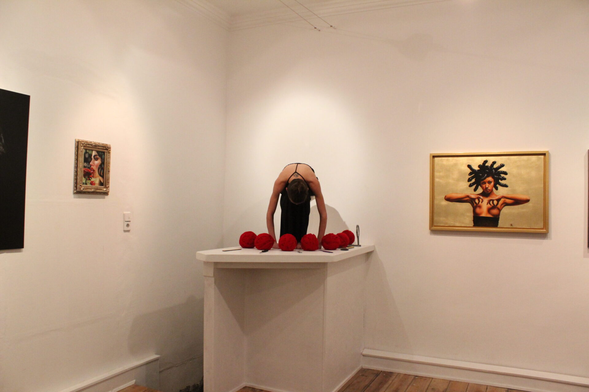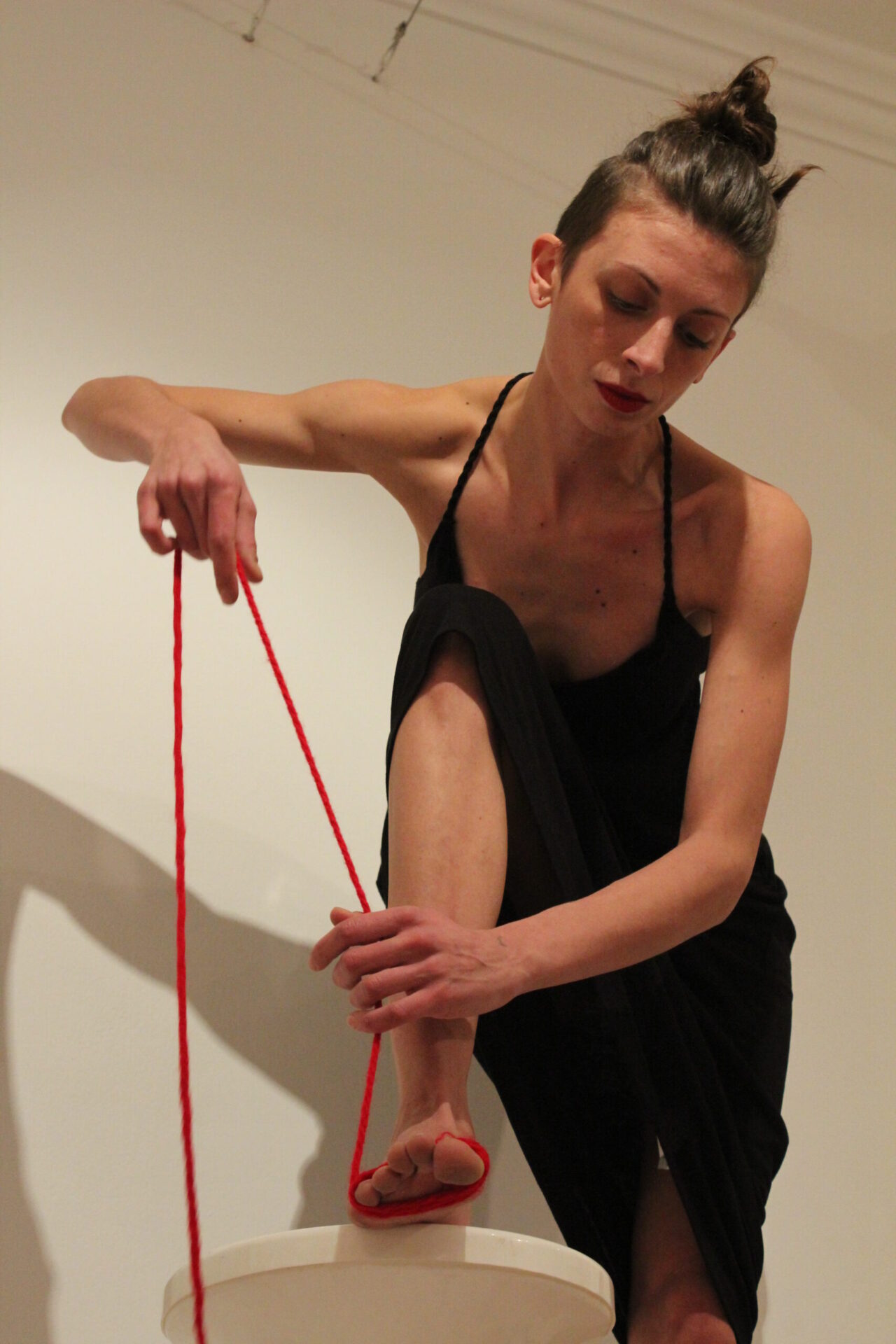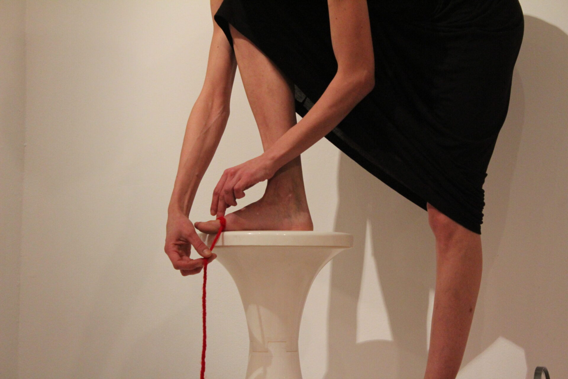 The feminine body has always been the biggest proponent and inspiration for beauty and sin, finding itself in the middle of the paradox generated by our intrinsic imperfection: the general parameters of the ideal body – an imposed model of what sexual attractive should be – don’t correspond of what actually is in nature. A woman naked body is animalistic, sensual, powerful and it comes in all shapes and sizes. In her performance Marta Lodola progressively wraps her own body with red wool and daily use objects, transforming it from its original identity and loading it with energetic power and mystical meaning. The color symbol of the paradox: red – sensuality and danger. In geo chromotherapy the red color is known for its gynecological and sexual functions, and more generally it is known for its energetic and initiating virtues, stimulation of blood circulation, in religious rituals and functions it keeps bad energies away and of course it is the color symbolizing eros and passion. The red wool is a material that has strong connection with magic and the feminine reproductive system. With this action the red wool becomes like a second skin, an elevating bridge to a whole new level of presence and conscience.