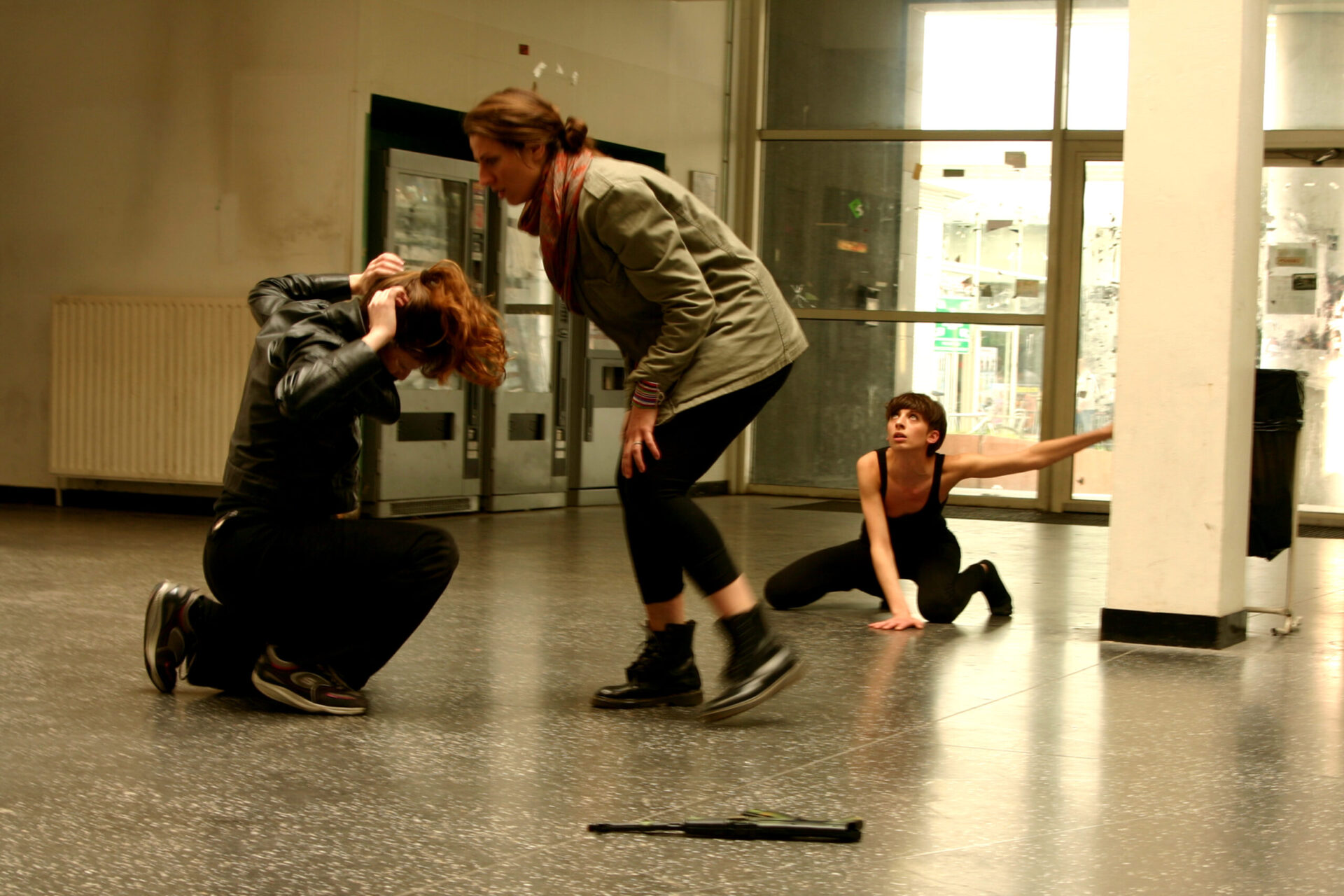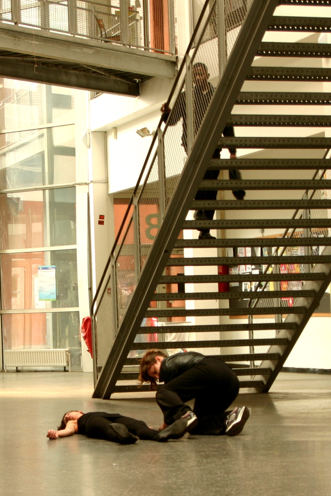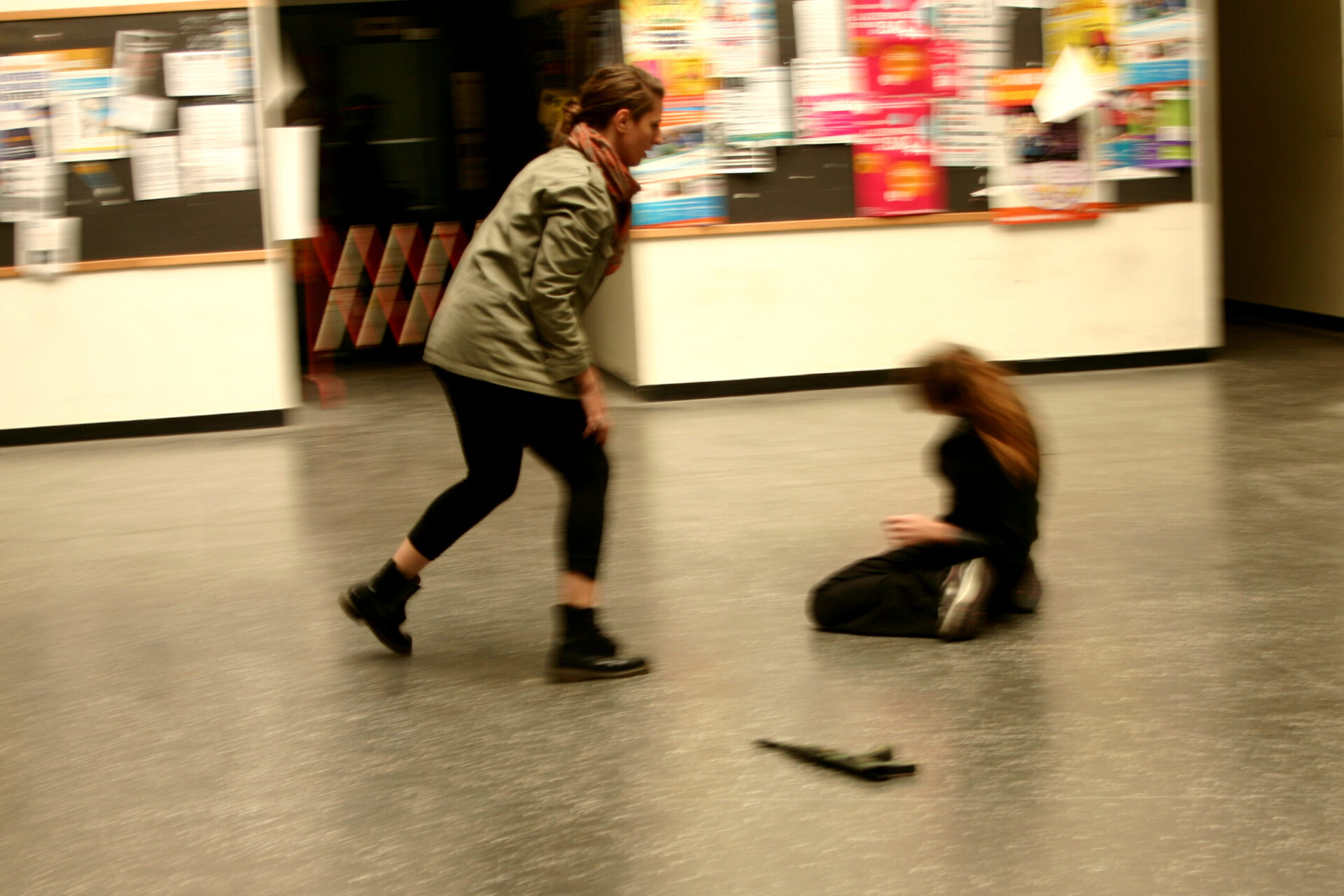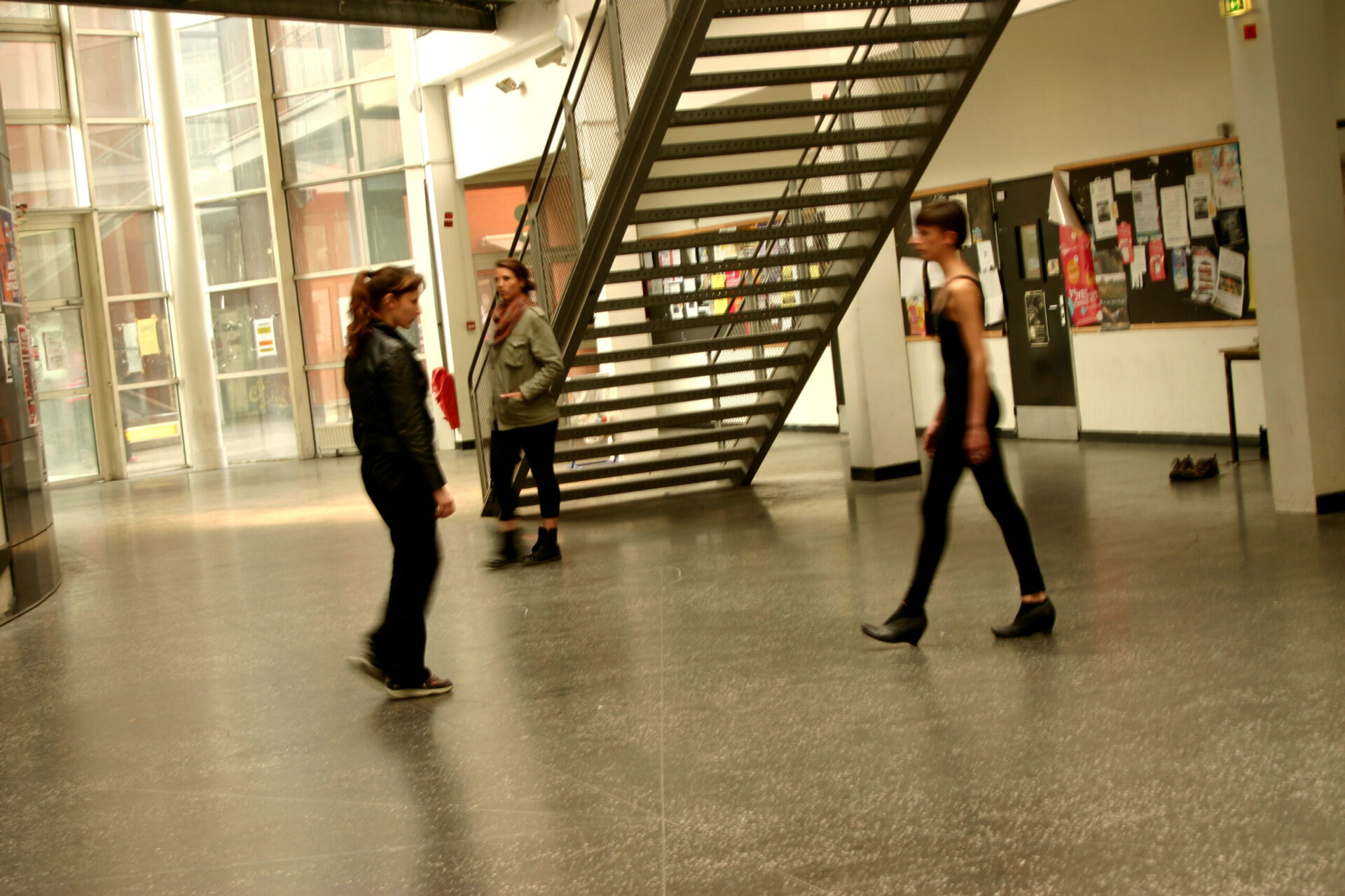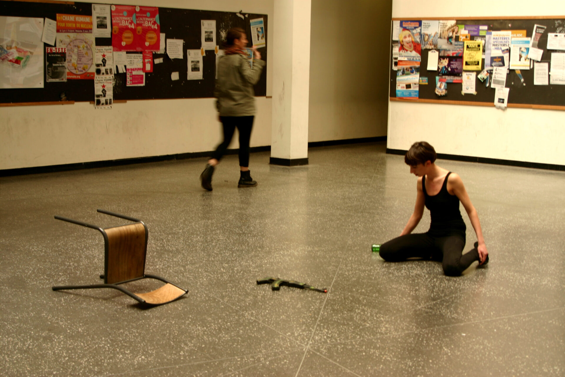 Notre défi, le temps pour pratiquer cette intersection, le cadre de la semaine des arts, et les limites des objets trouvé sur place et la structure architectonique. Seul le rapport entre le lieu, sa population et nos corps a pu garantir quelque chose, une compatibilité divergente, entre l’hostilité d’une occupation et la médiation d’une ouverture, un écrasement calculé, une résurrection volontaire et le risque à tout instant de s’inscrire dans l’imposition du « je ».