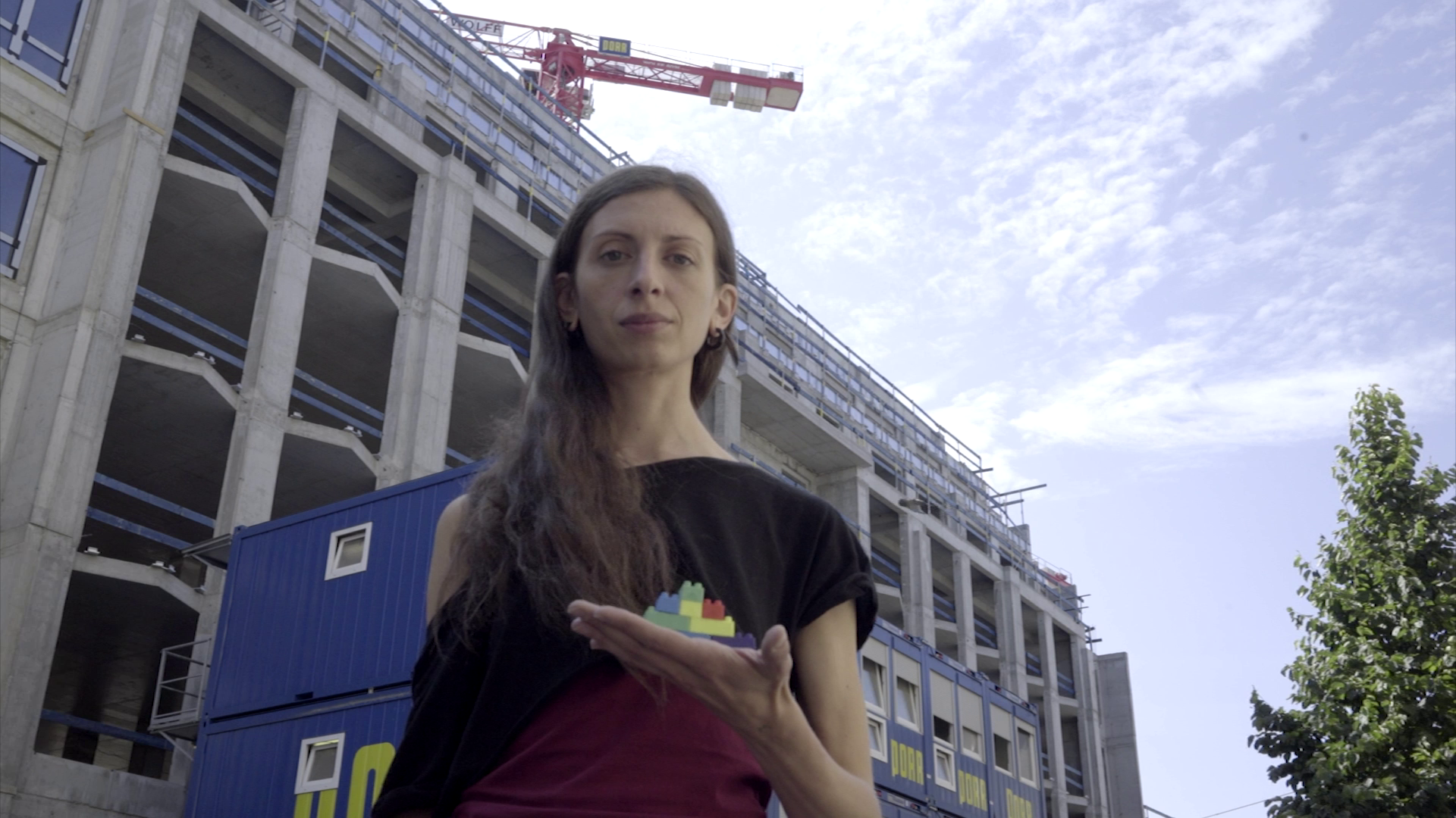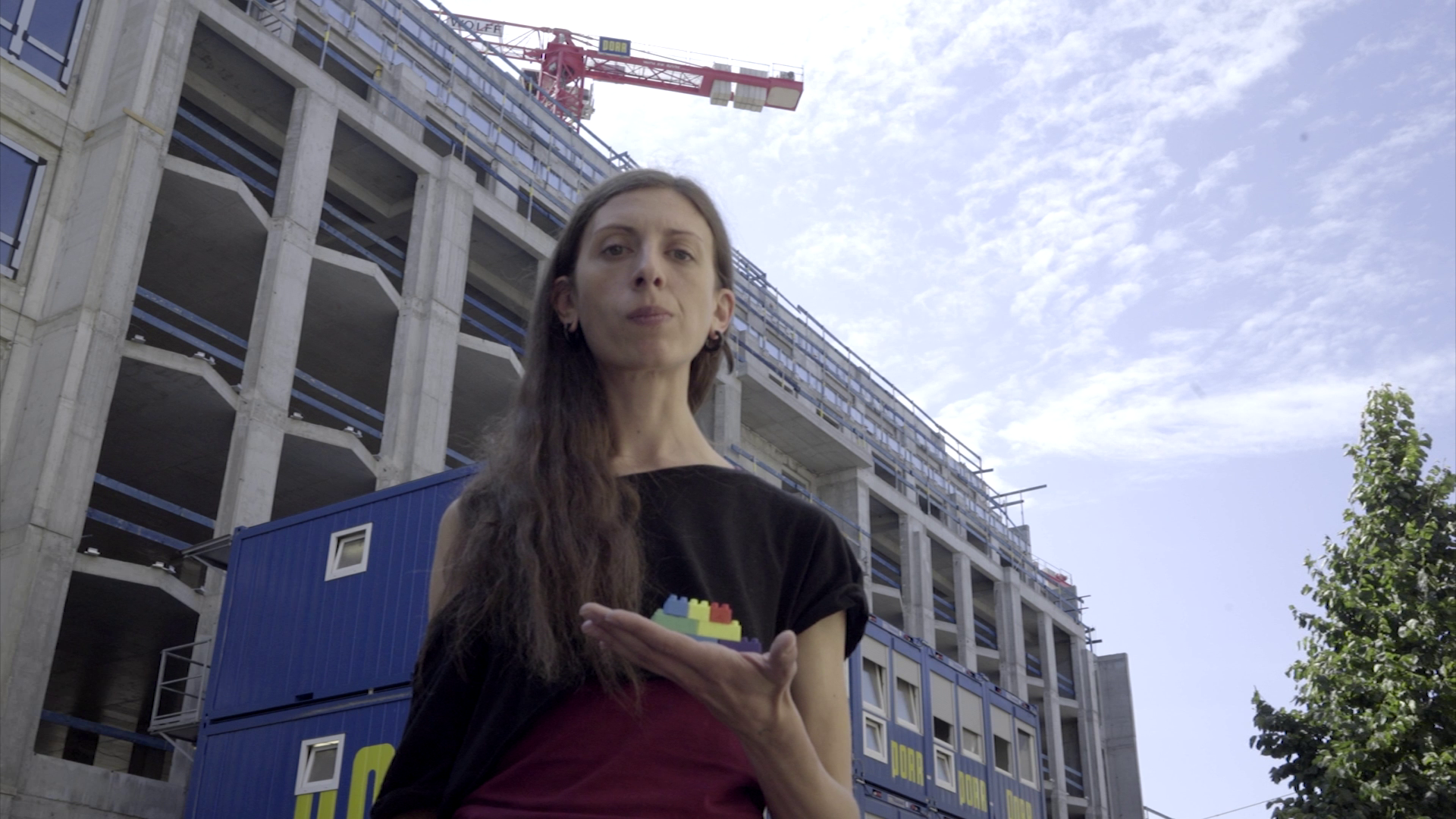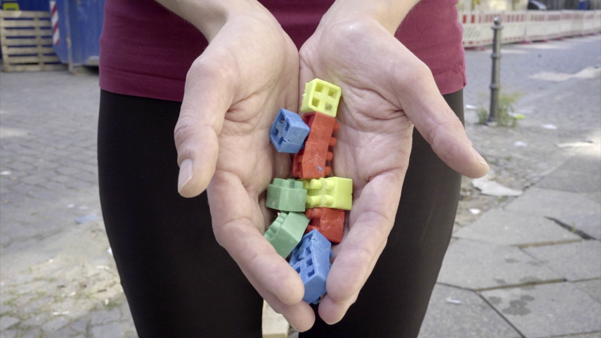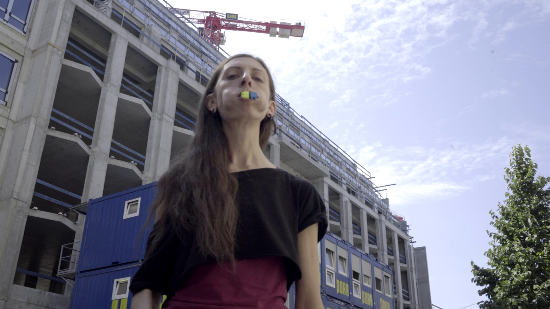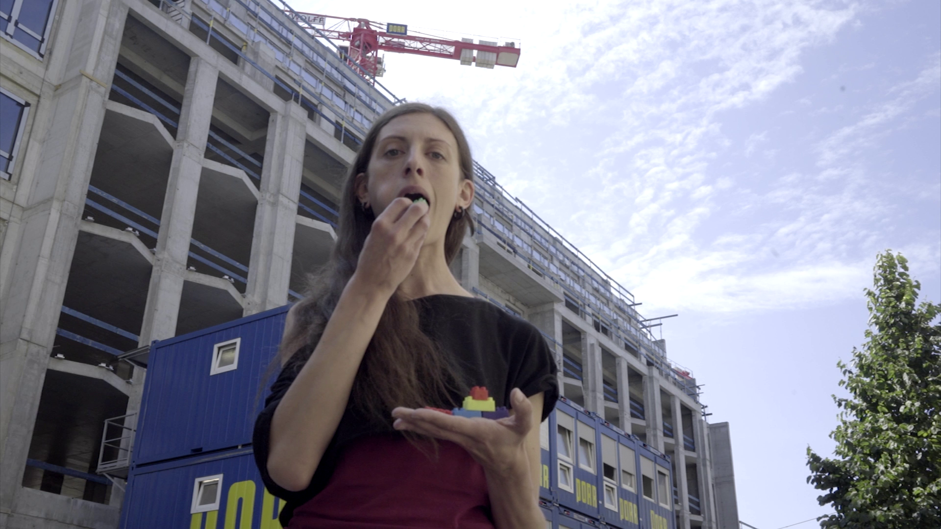 I hold a LEGO-shaped triangular brick made of erasers in my hand. One after another I put the bricks in my mouth and chew them. They remain intact, although I keep chewing them. Despite the rubber mass exceeding my mouth’s capacity, I continue my action until none of the bricks remain. The noise coming from the construction site along with the cars’ rumble are blended with the sounds of my body.