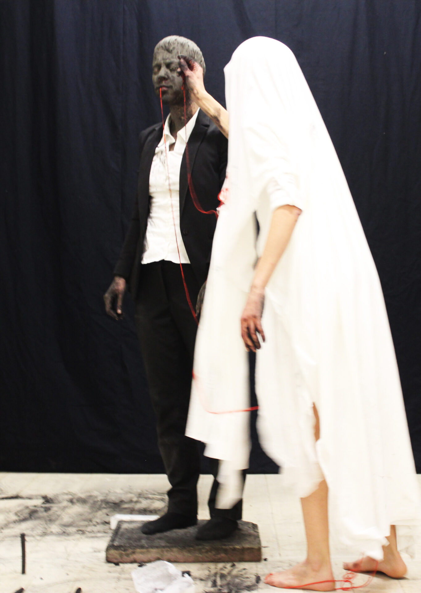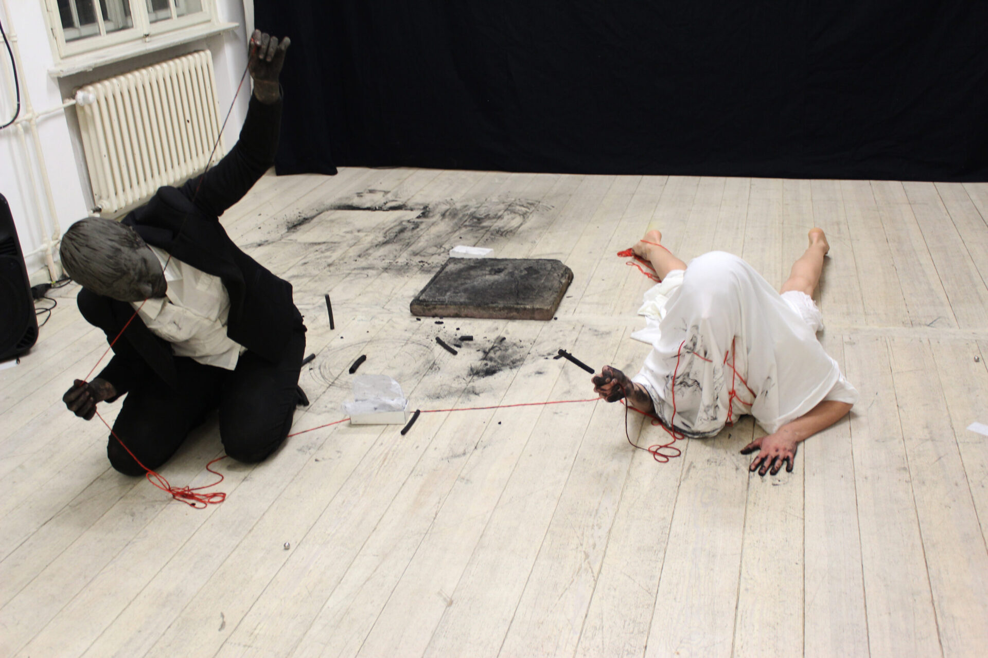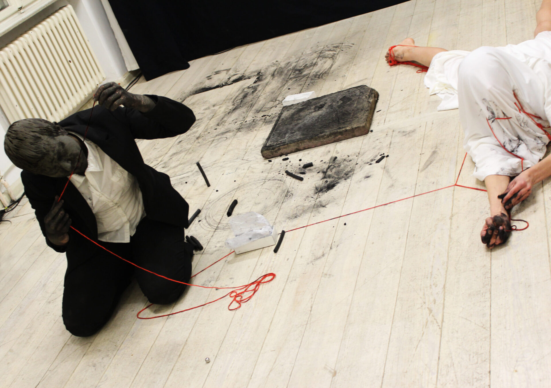 Performance by Marta Lodola and Ruth Biene, duration 30 min. Materials: white textile, acrylic red wool, needle, charcoal, black clay, performers’ movement.