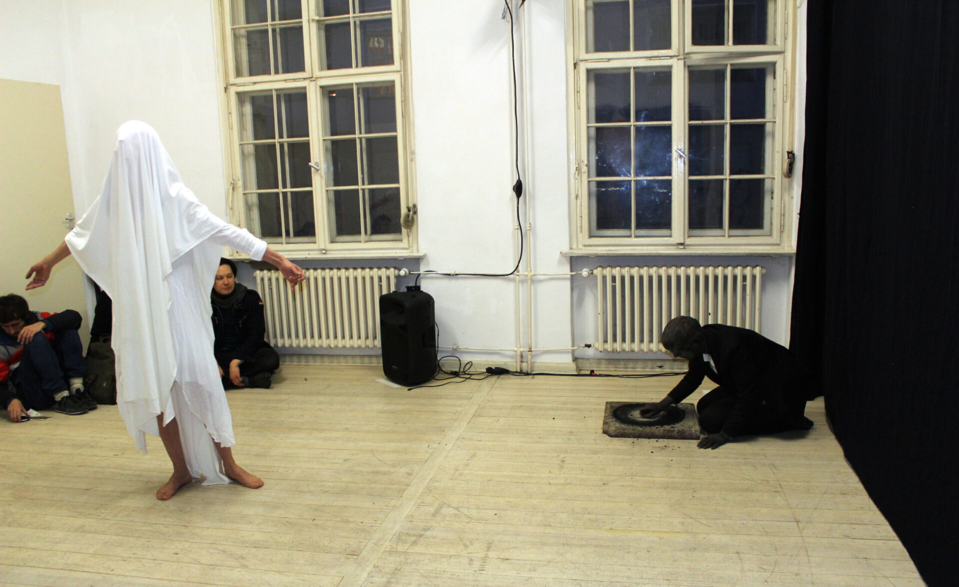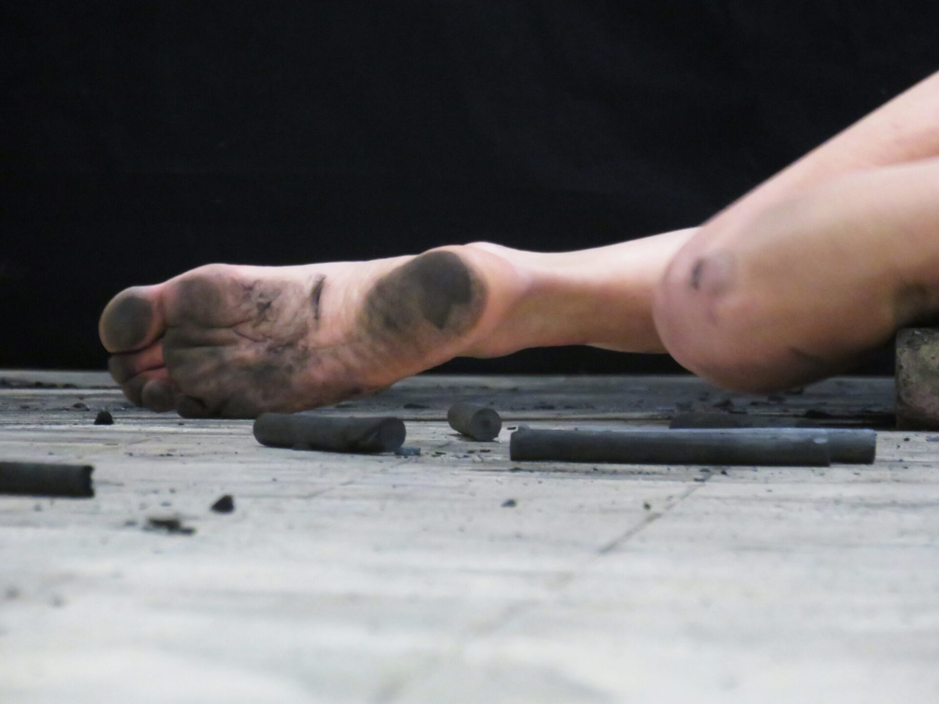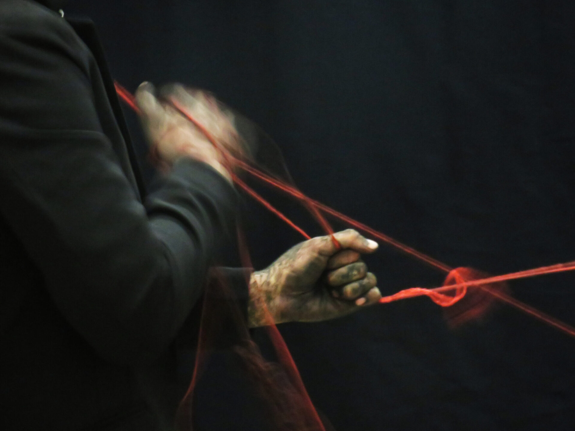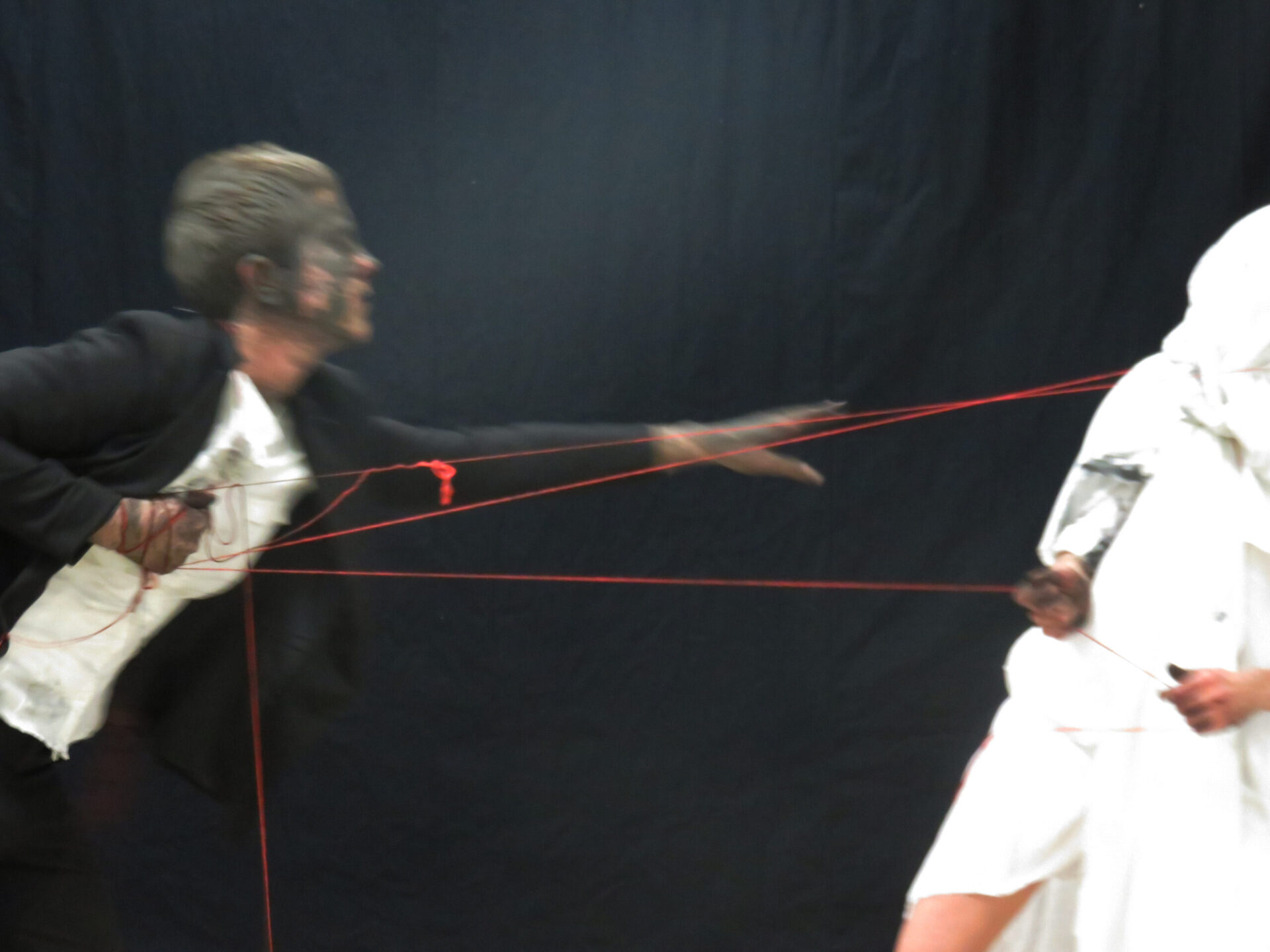 Performance by Marta Lodola and Ruth Biene, duration 30 min. Materials: white textile, acrylic red wool, needle, charcoal, black clay, performers’ movement.