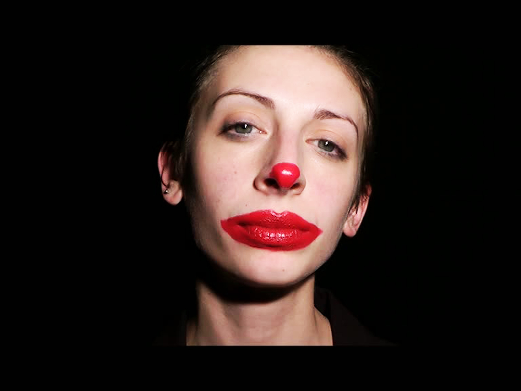Here I create this metaphor: watching the camera, I paint over and over my lips drawing a bigger mouth and a clown nose with a red lipstick.drawing a clown face.