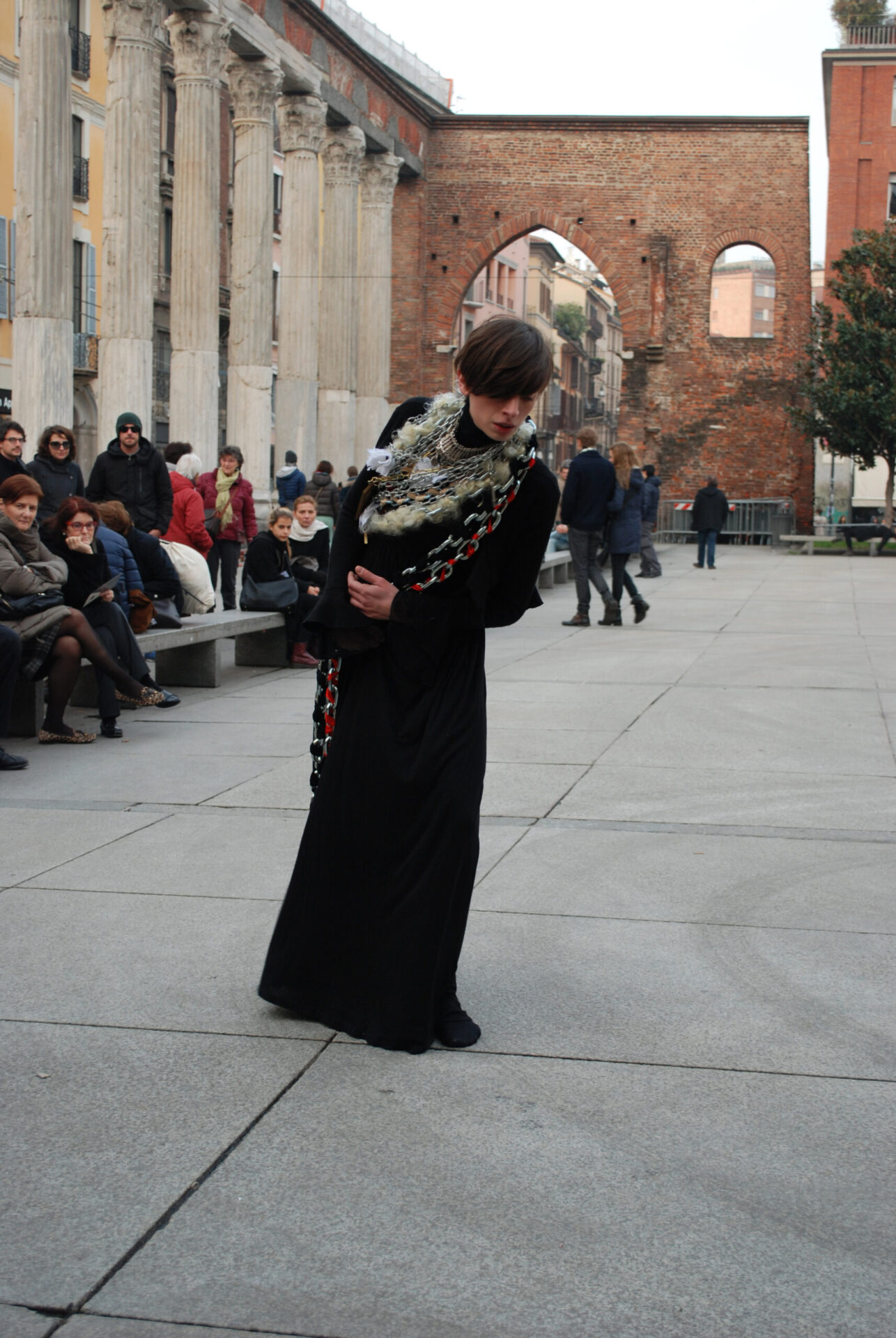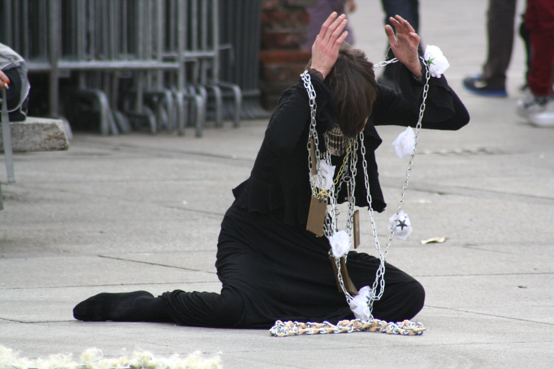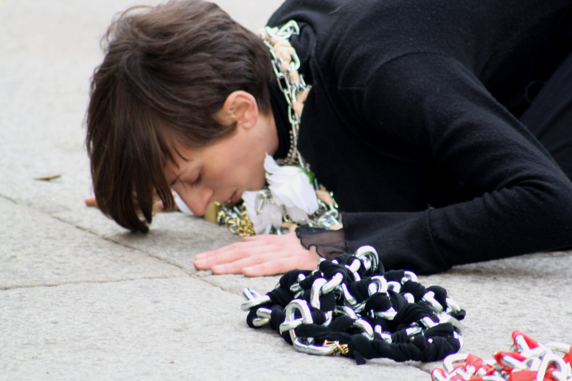 In this work I wear nine necklaces that will add up and increase in weight gradually. Each symbol on them represents the conditioning that women experience in our society, a weight that every women receives from their culture, family, religion, society and relationships. The more chains I wear, the more difficult it becomes to stand up. With the last one, the weight lets me fall down on the floor, where I progressively remove each chain and I set myself free.