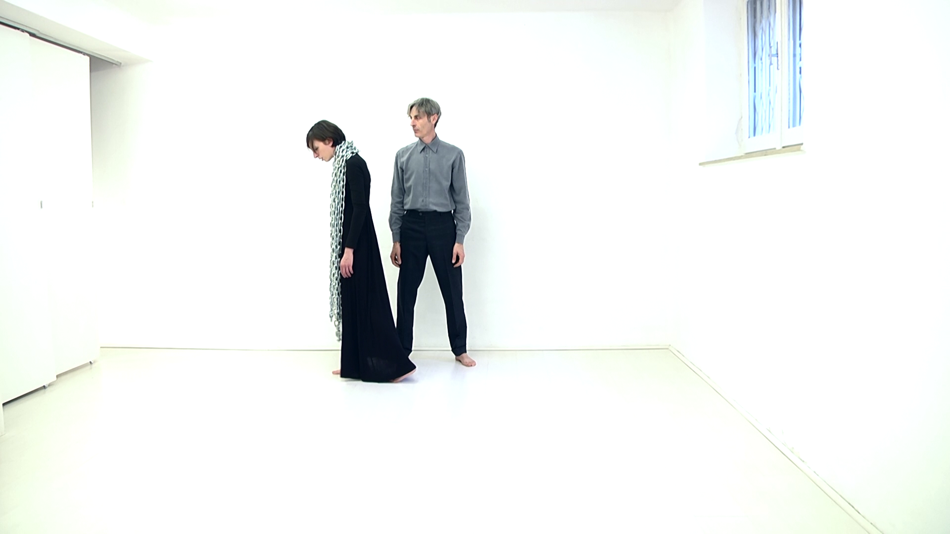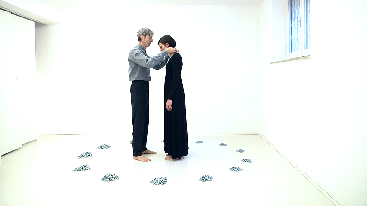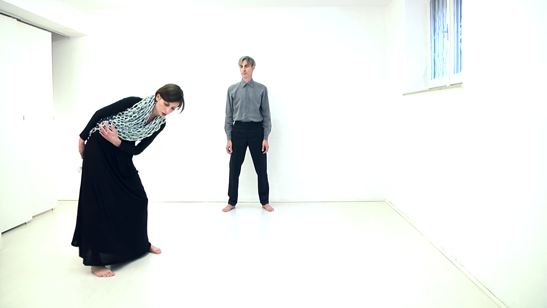 The gesture of giving a gift is repeated 14 times. Each gift is a necklace made of chain, and each of them weights more than the previous one. I receive each necklace after bending over until I touch the floor with my face and stand up again, ready to receive the next one. The total weight of the chains reaches almost my body weight (48 Kg). After receiving all of them, I fall down on the floor, finding the way to leave the chains behind.