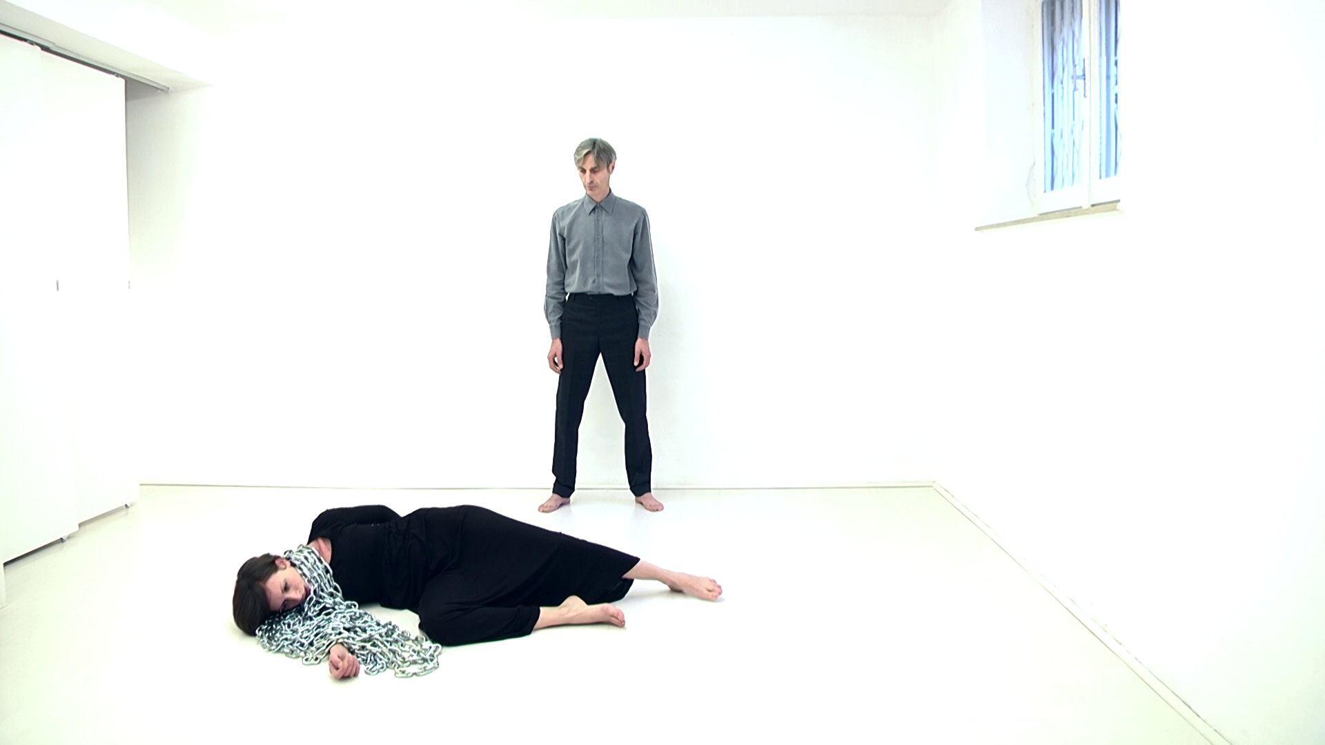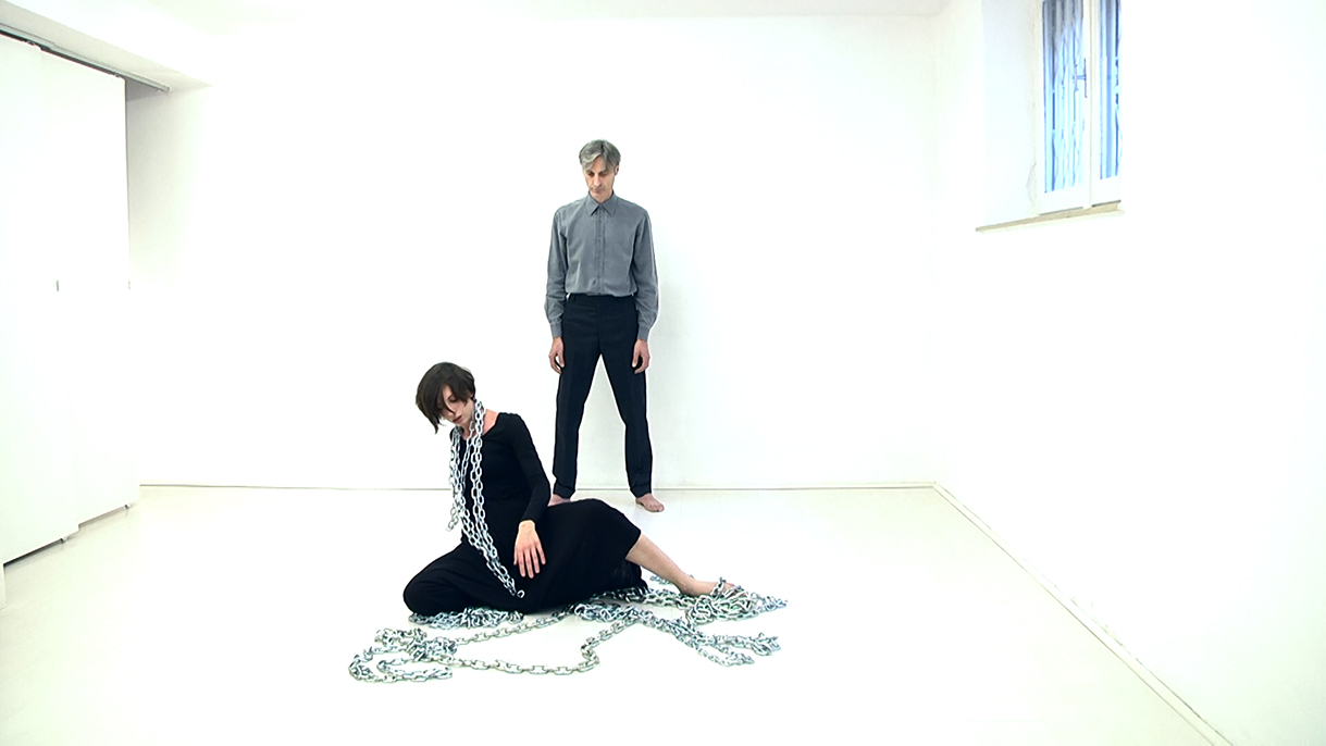 Video performance by Marta Lodola in collaboration with Valerio Ambiveri, Video Color Stereo 15 min 49 sec. Materials: chains (total weight 40 Kg), repetition.