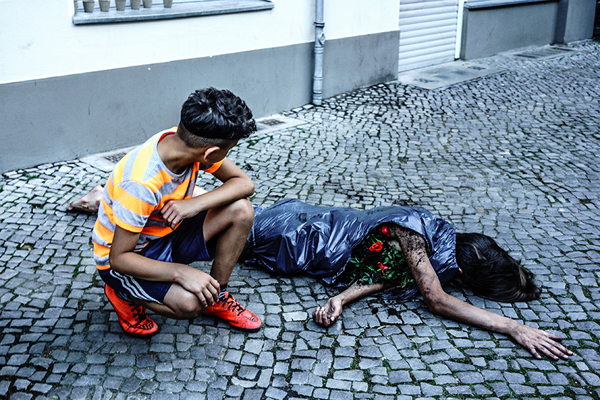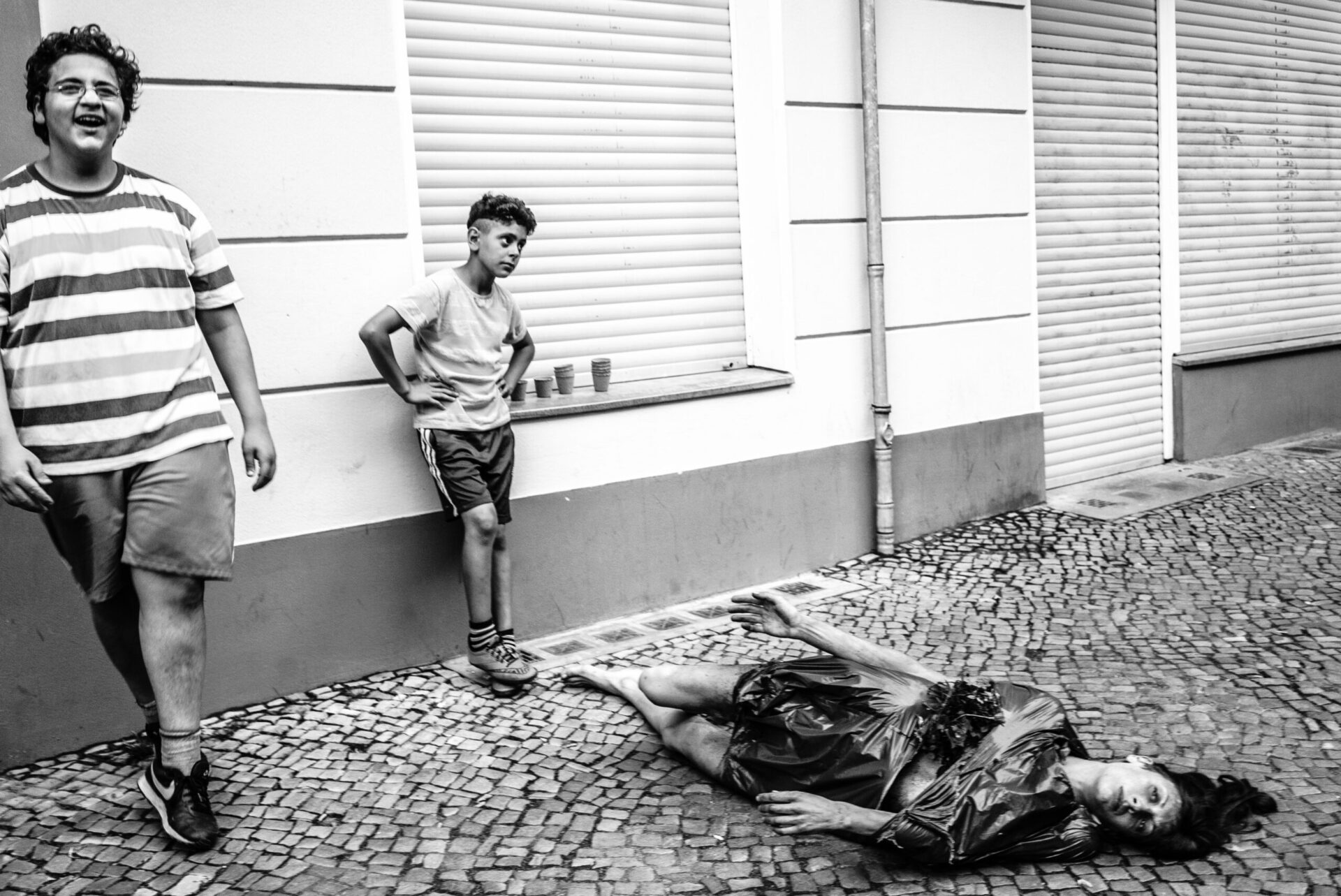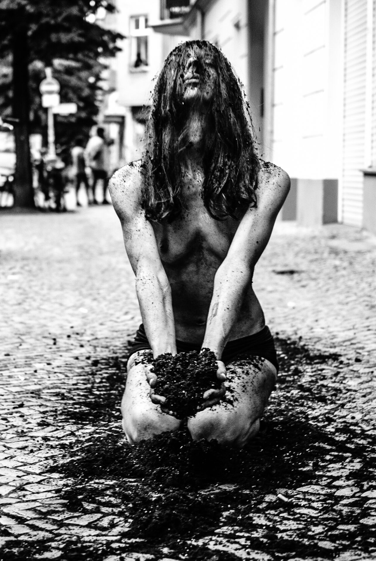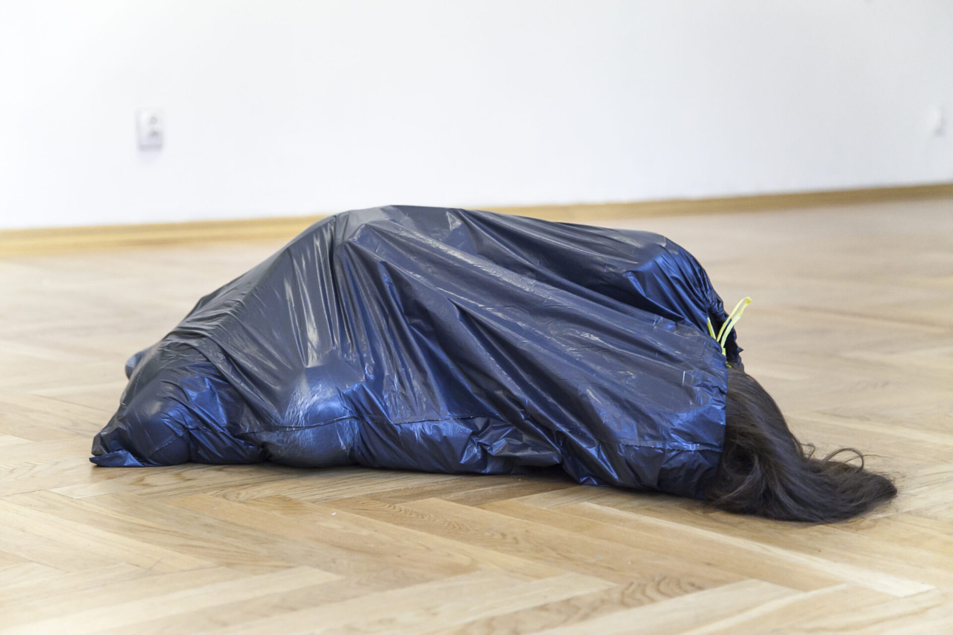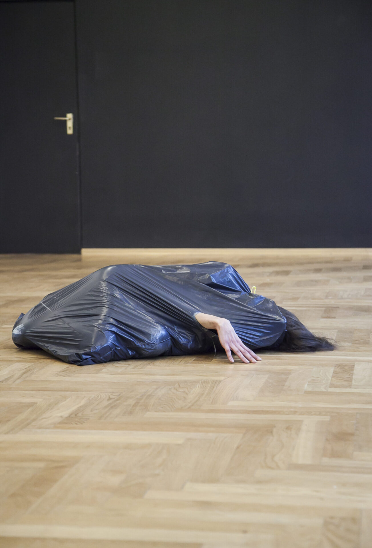 I lay down on the street hidden in a trash bag without moving, only my hair can be seen outside. I hold a rose plant without vase in my hands. Some people don’t notice me, others interacts with me, others are alarmed by my immobile figure and call the police.