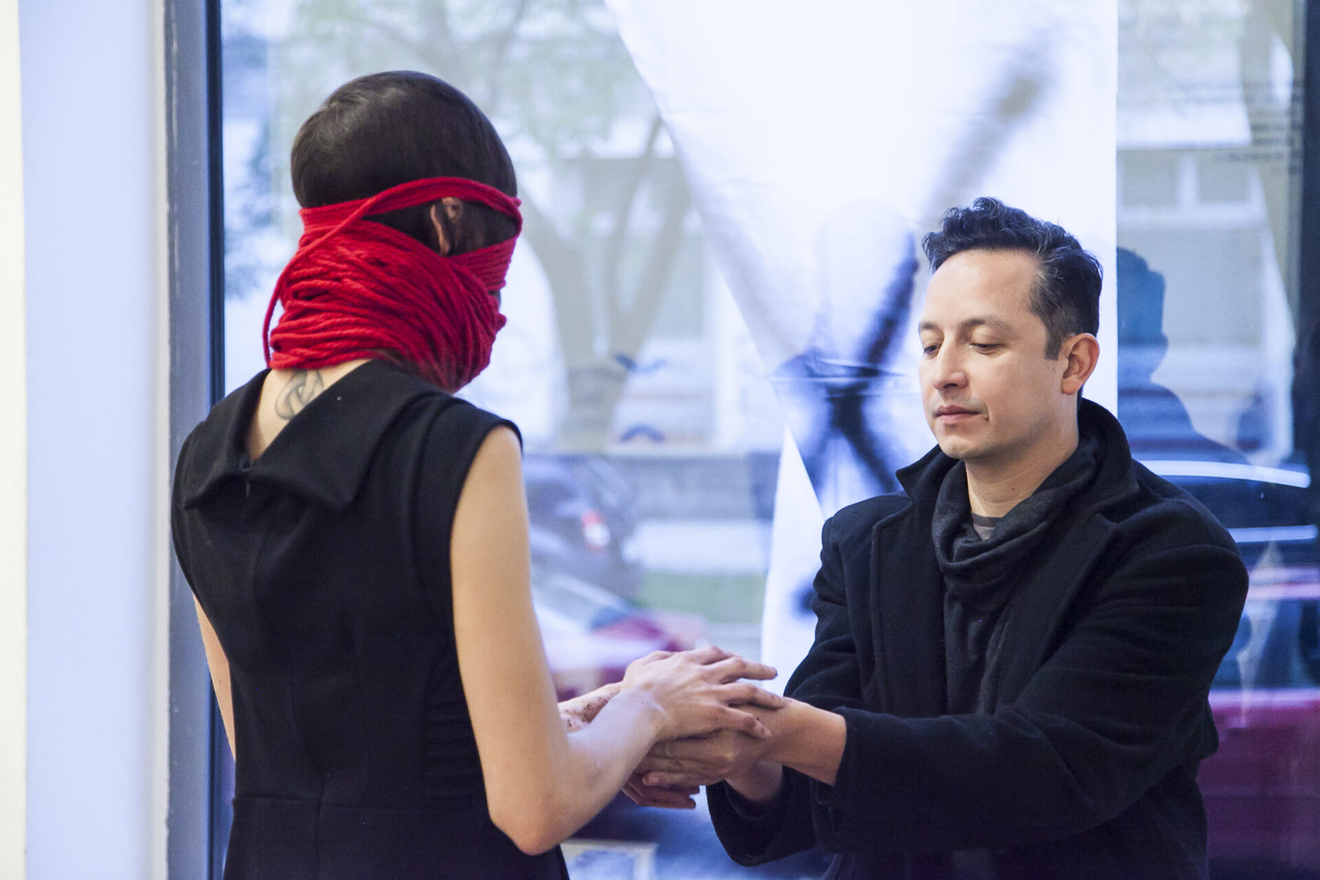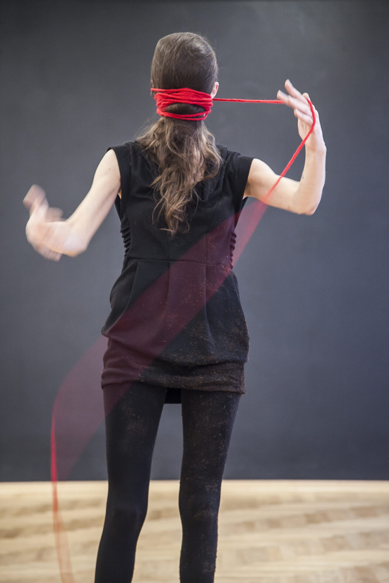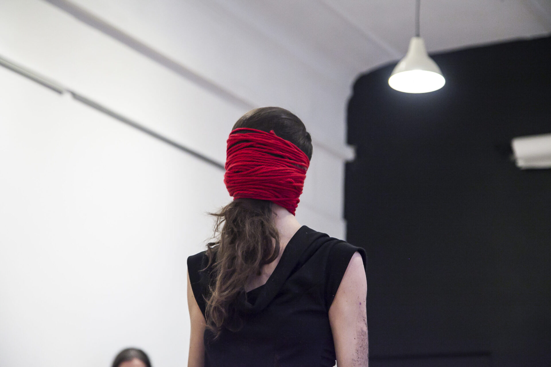 I lay down on the floor of the gallery space, hidden in a trash bag without moving, only my hair can be seen outside. I hold in my hands plant bulbs and soil wrapped in black cotton cloth. The public is all around in a circle. I come out from the plastic in an elegant suit and heels. I blindfold myself covering my face with my hair and wrapping my head with red wool. I intuitively reach different people and I give them the small package with the bulbs inside, whispering “Can you take care of them for me?”