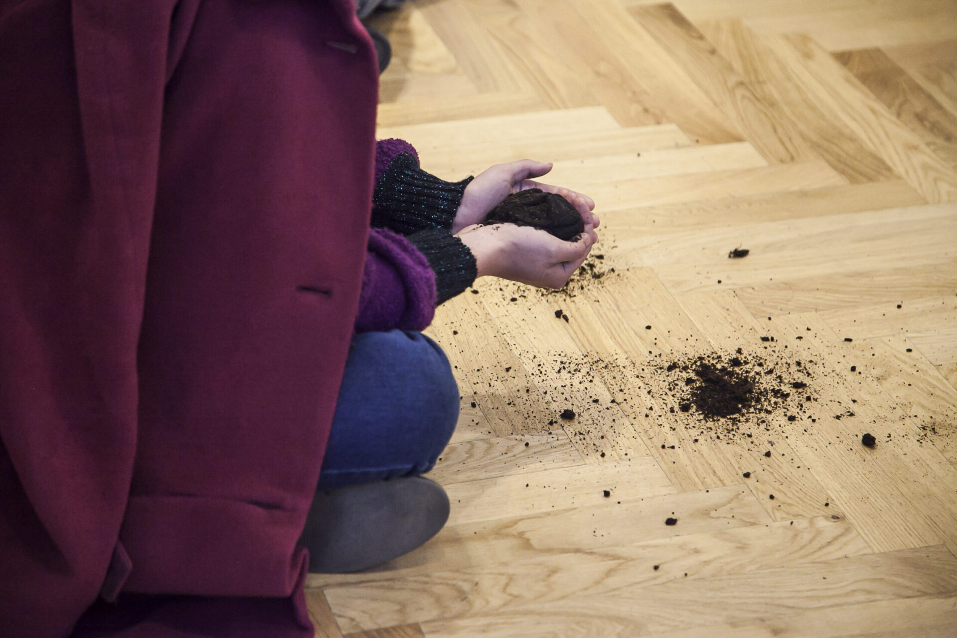 Site-specific performance by Marta Lodola, duration 1 hour and 30 min. Materials: trash bag, elegant suit, plant’s bulbs, black textile, red wool, soil, public engagement