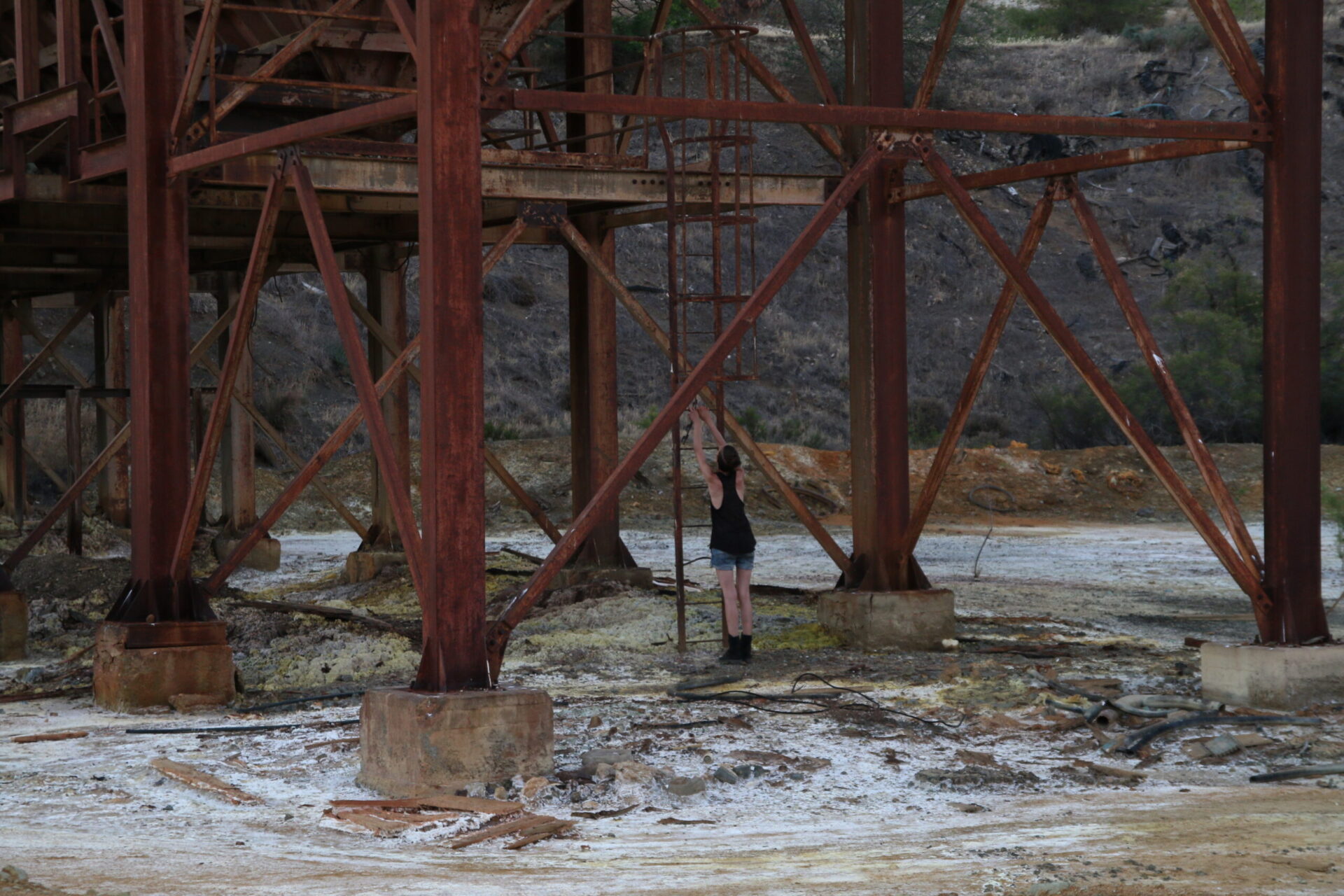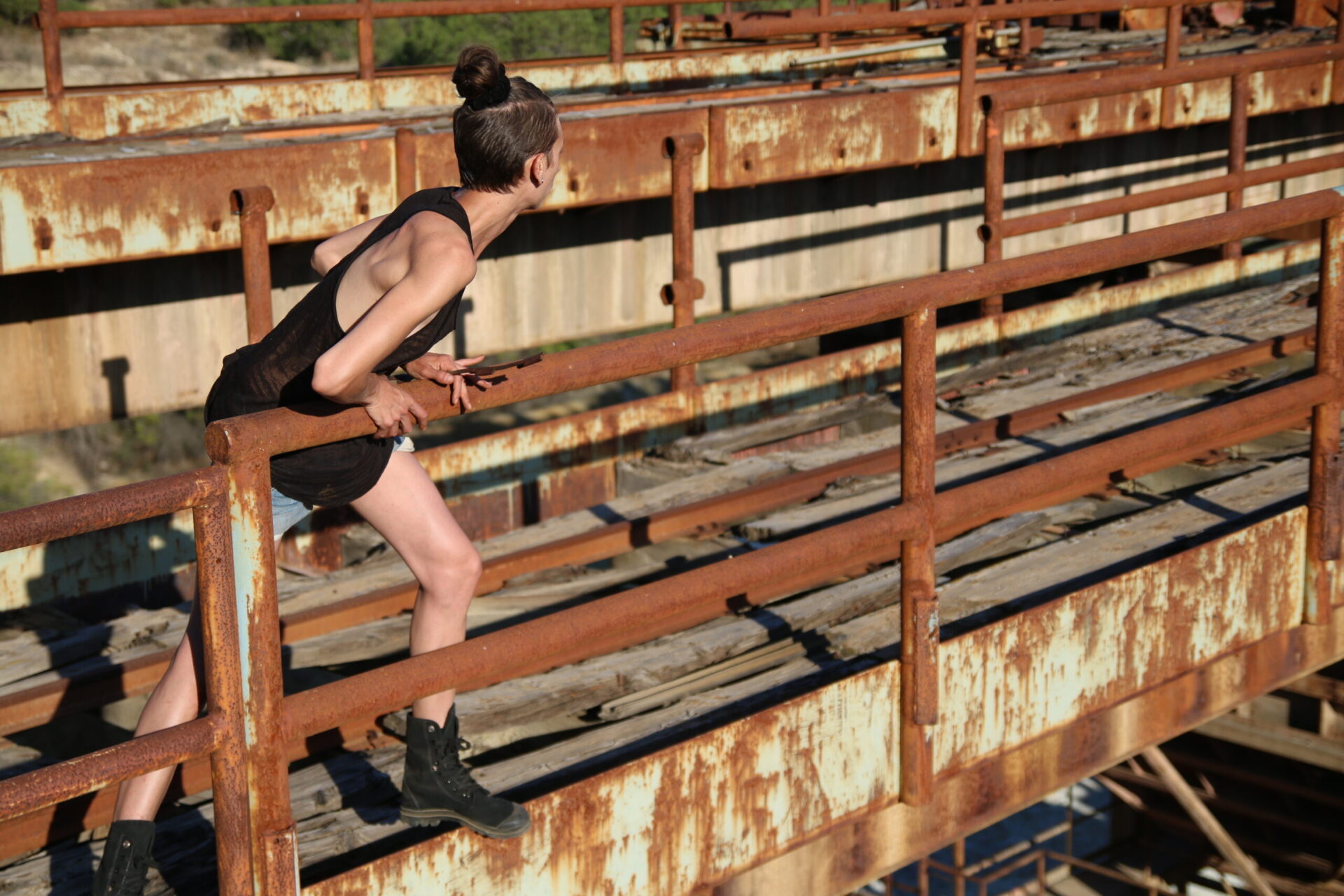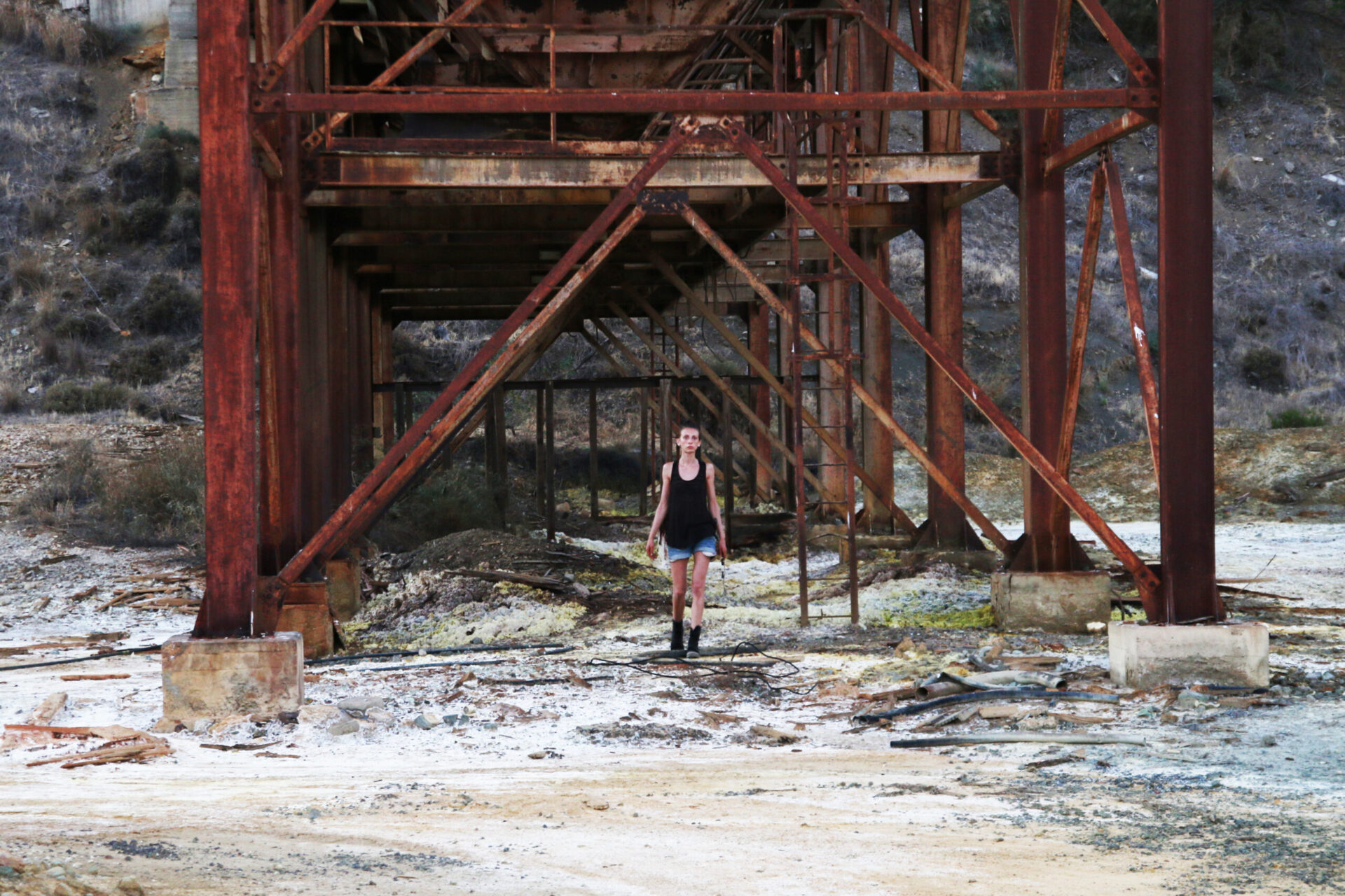 In a site-specific action held in an old mine with a huge metal structure, I find a metal bar that I use for the entire duration of the performance. I explore the metal structure sliding the metal bar over a railing, until I reach the furthest point, where I start hitting a bell that was part of the machinery, while I scream “Work is everything, work is nothing”. Repetition, exhaustion and overcoming fear are the main concepts of this work.